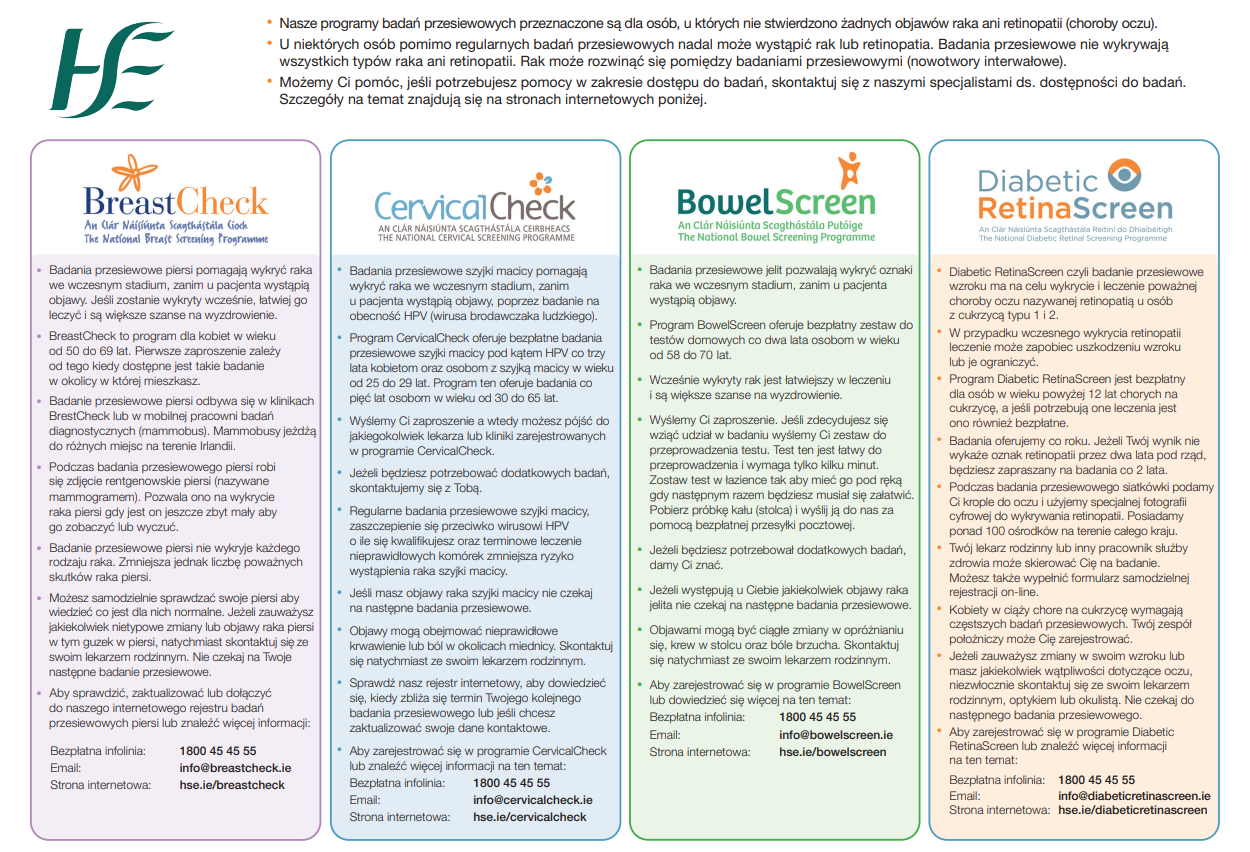 Information and advice about the four national screening services in Polish